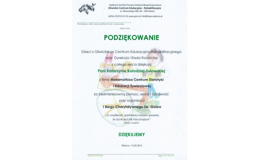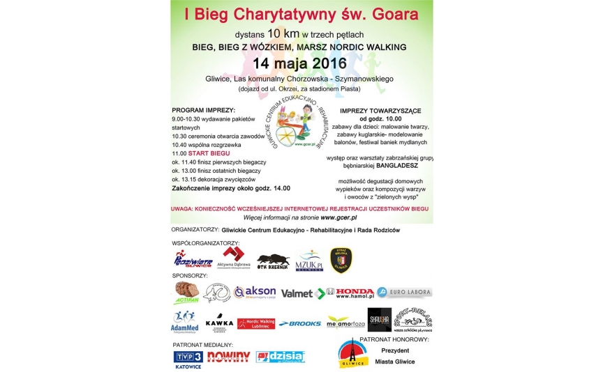 Miło nam poinformować, że Nasze Centrum Dietetyki i Edukacji Żywieniowej METAMORFOZA jest jednym ze sponsorów organizowanego przez Gliwickie Centrum Edukacyjno - Rehabilitacyjne "I Biegu św. Goara". Podczas biegu każdy będzie mógł sprawdzić swoją formę, a także skorzystać z porad naszego dietetyka. Jednocześnie wesprzemy tym samym szczytny cel imprezy, którym jest doposażenie placu zabaw dla dzieci z Gliwickiego Centrum Edukacyjno - Rehabilitacyjnego. Nie zwlekaj!!!, zapisz ...