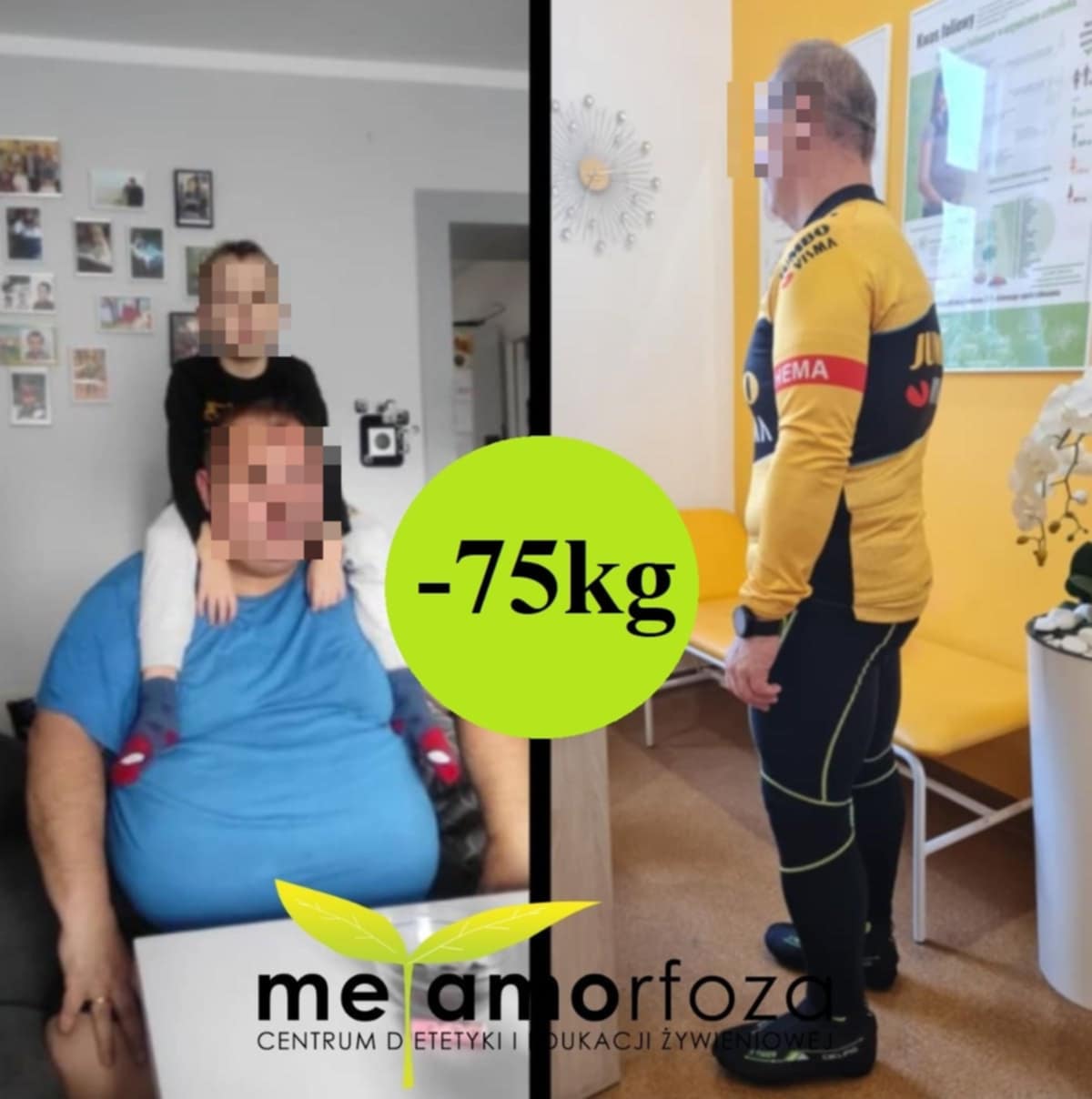 kilkudziesięciu zbędnych kilogramów. Przedstawiam dziś Pana Tomasza, schudł 75kg (waga początkowa 185kg, dziś waży 110kg). Osiągnął ten efekt w dwa lata. Jestem bardzo dumna z niego. Był o krok od operacji bariatrycznej. Postanowił jednak mi zaufać.