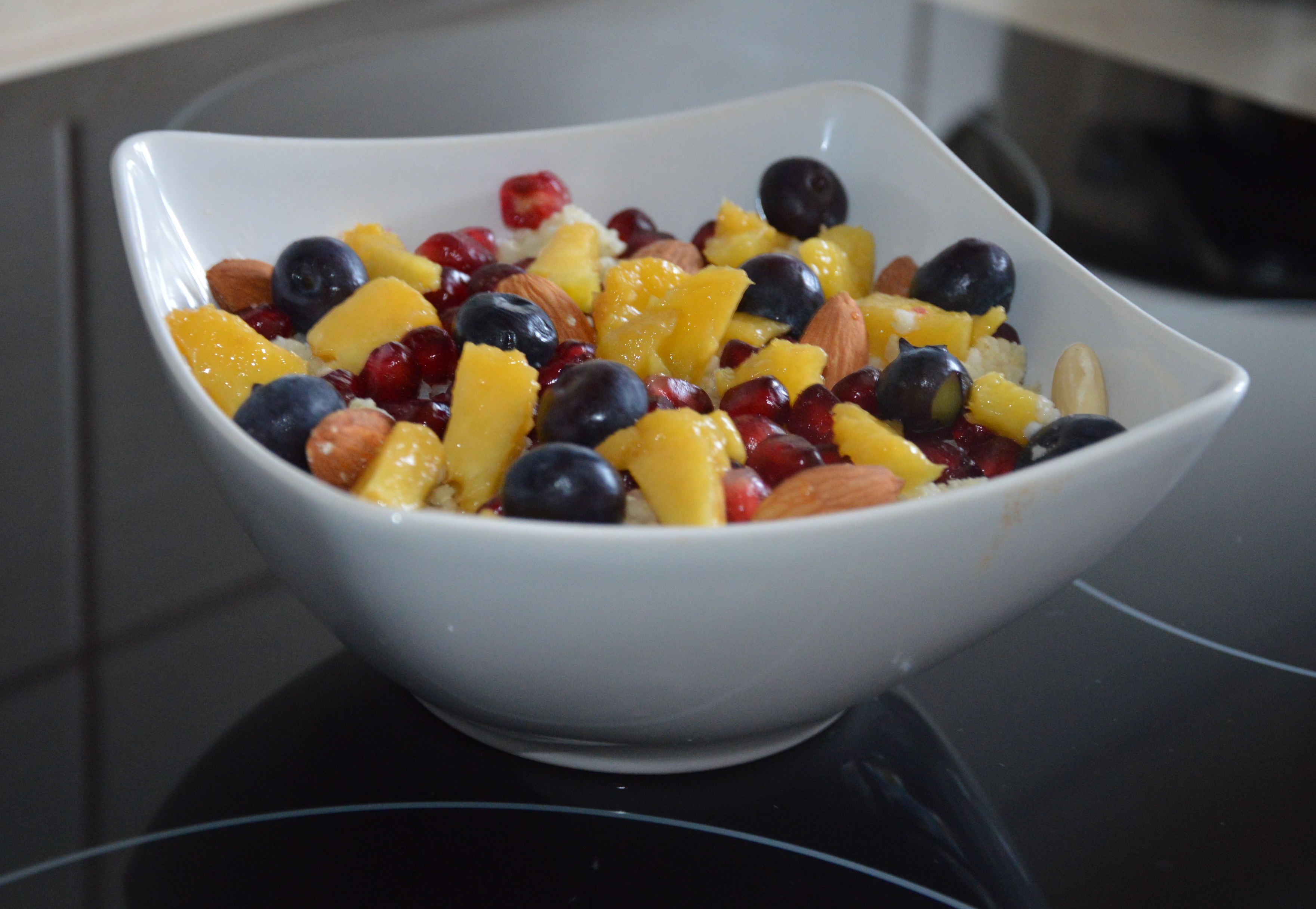 Ugotować kaszę jaglaną. Nieodpowiednio ugotowana ma smak goryczki. Aby temu zapobiec przed ugotowaniem należy opłukać ją na sitku pod bieżącą wodą (Można zalać ją wrzątkiem). Brzoskwinię obrać ze skórki, pokroić w kostkę, dodać borówki, granat i migdały, całość wymieszać z jogurtem naturalnym.