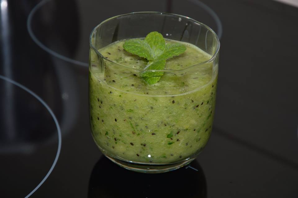 Mięta i cytryna słyną ze swoich właściwości orzeźwiających, a w połączeniu tych dwóch składników z kiwi, pietruszką i lodem jest to istne szaleństwo świeżości i ochłodzenia.
