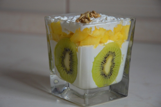 Serek ½ opakowania przekładamy do miseczki. Ananasa obieramy ze skóry i wykrawamy zdrewniały środek, drobno kroimy i przekładamy do miseczki. Kolejno ułożyć ½ serka. Posypać pestkami słonecznika.