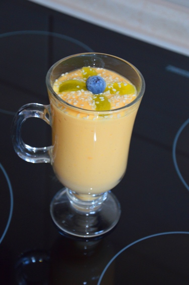 Mango obieramy, zalewamy pozostałymi składnikami i miksujemy na gładką masę.