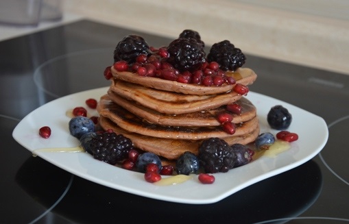 4) Gotowe placuszki polewamy miodem, dekorujemy owocami.